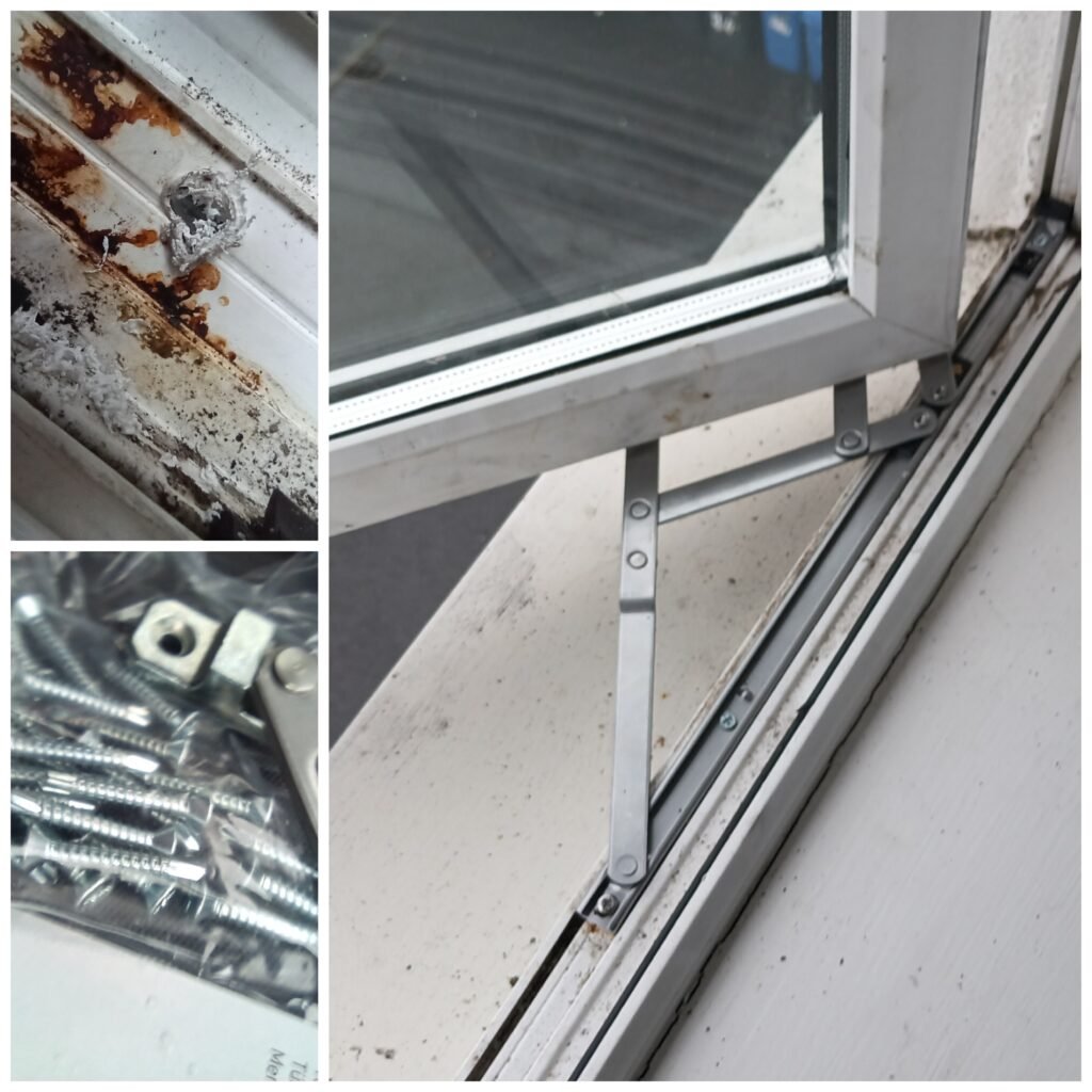 Just replaced some corroded window hinges on a PVC frame. Here’s the thing—PVC windows have steel reinforcement inside, so you need self-tapping screws, not standard ones. Most people know this. Some don’t. We do. Old hinges were ready for retirement. New ones? Solid. Window repairs, hinge replacements, frame fixes. Give us a shout for a quote.